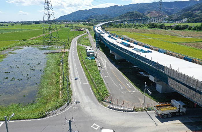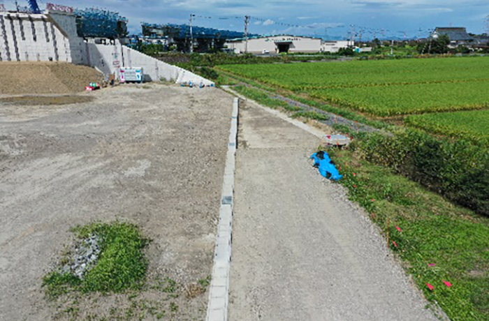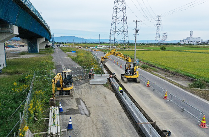 海津工区(志津新田交差点付近)では西側排水工の設置が完了。引き続き東側の排水工の施工を進めます。