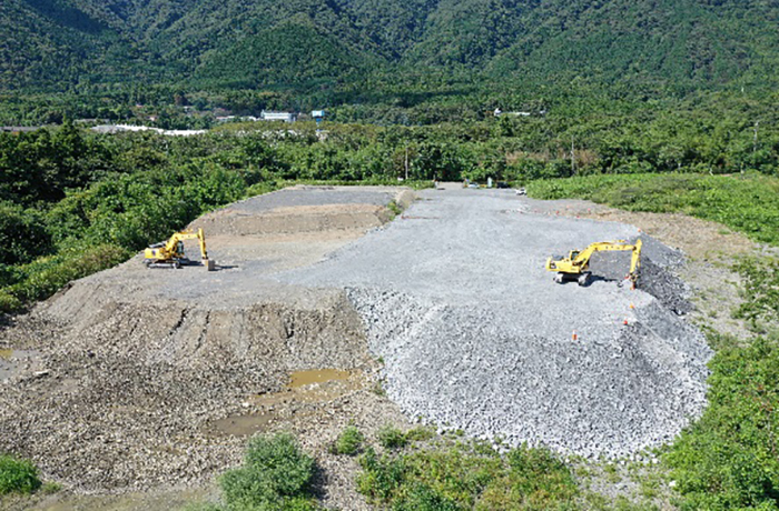4月中旬から養老町一色地先の残土仮置き場において他工事からの土砂を受け入れ整地作業を進めています。