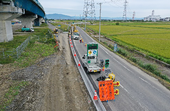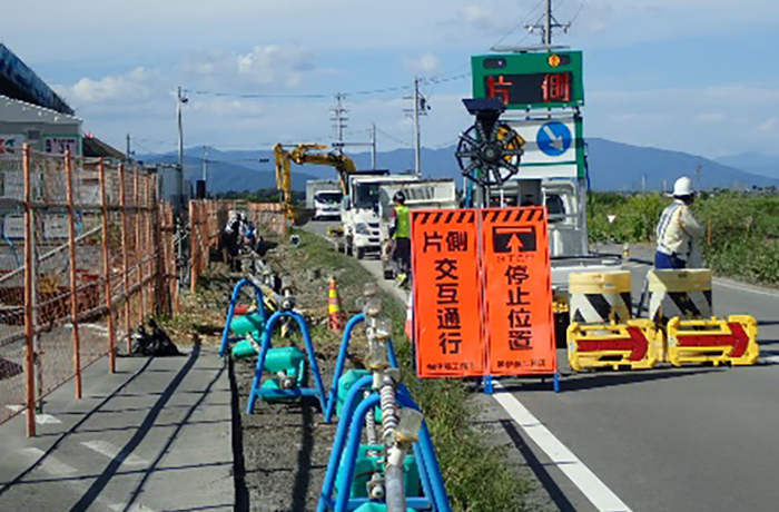 海津工区の排水構造物設置を進めています。広域農道を片交規制にて進めてきましたが10月末完了いたしました。
