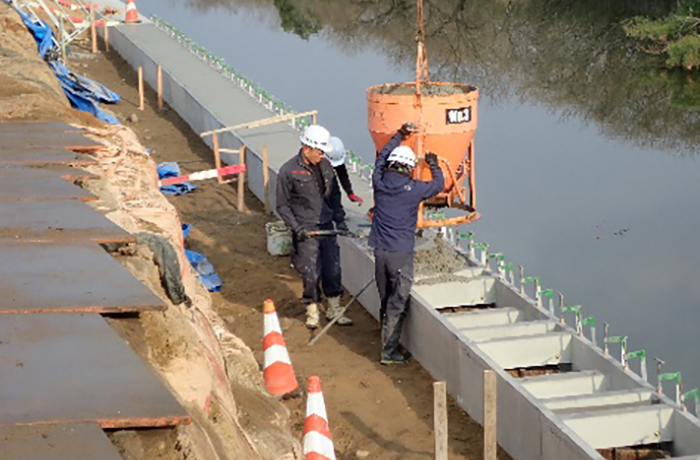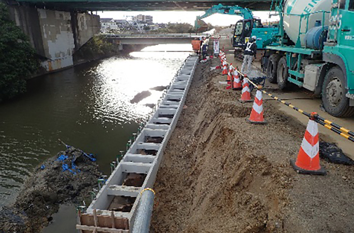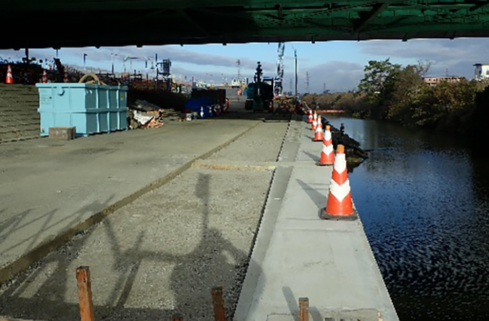 9月より高速道路直下の施工に入りました。過年度施工に続き、既設護岸(コンクリートパネル・H鋼)の撤去を先行し笠コンクリートの施工を進めています。