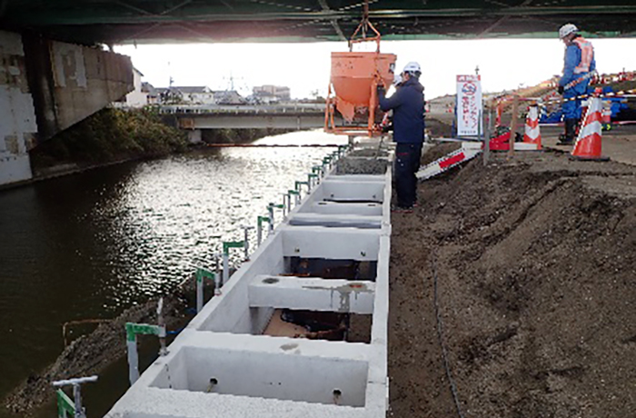 10月1日より仮設ヤード整備として堤防掘削を開始、崩落防止対策として大型土嚢にて法尻を補強、シートにて養生を行います。