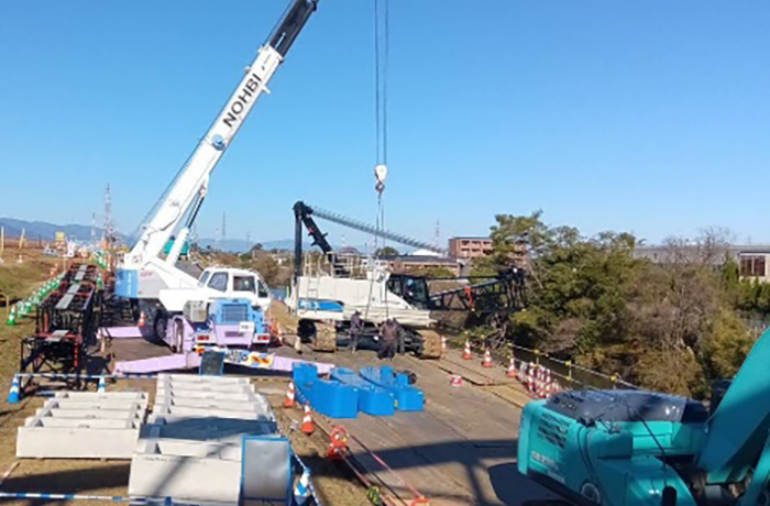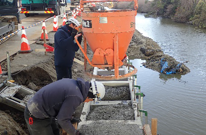 既設護岸H鋼の切断を進めます。橋梁直下の平ブロック張が完了しました。舗装工の路盤工まで施工が完了しています。