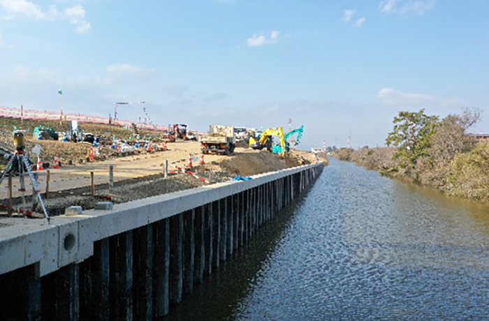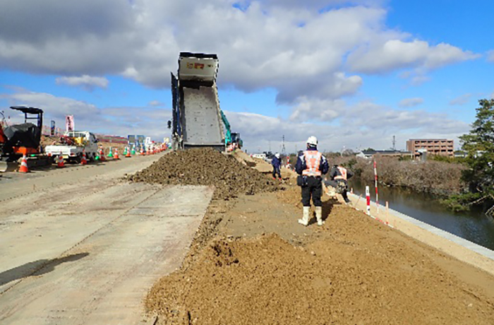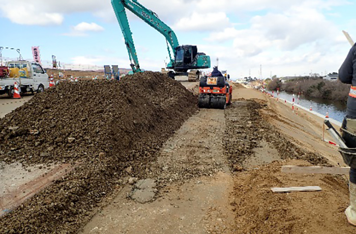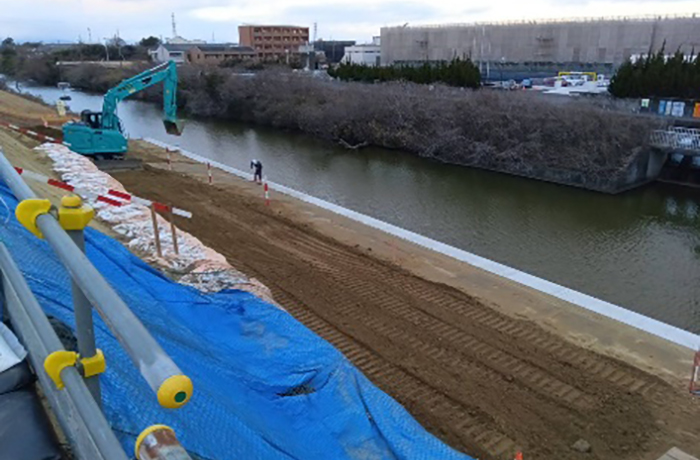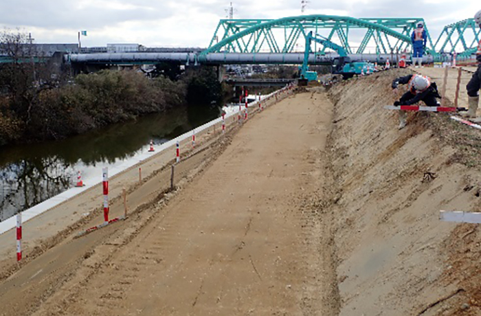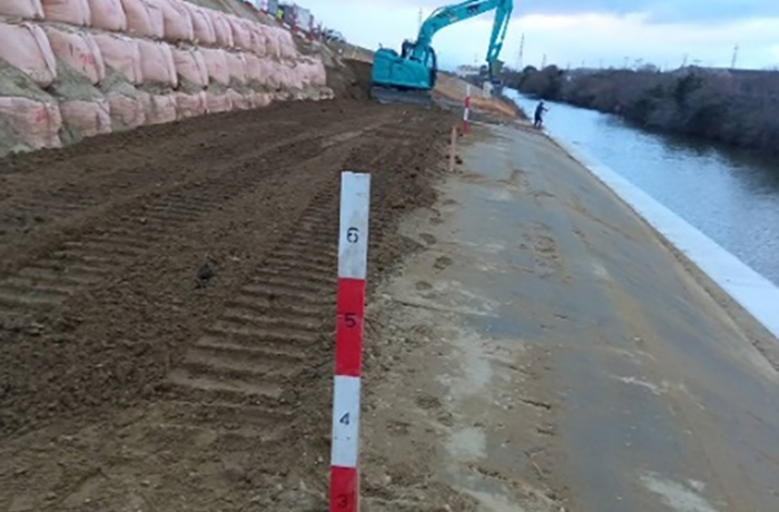 河川土工(埋戻し・堤防復旧)堤防開削土を利用し堤防の復旧作業と法面仕上げ作業を進めています