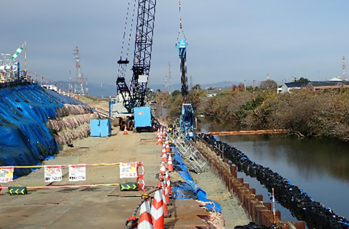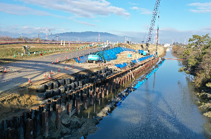 4.5H型11.5mの施工を継続しています。高速道路直下の仮締切工を撤去しました。
