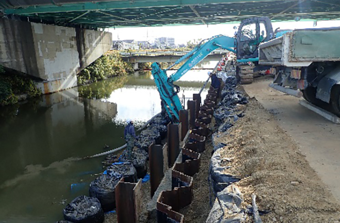 10月に入り鋼矢板打設の為のヤード整備として堤防掘削を開始しました。表土除去から開始。現地盤が砂質土であり崩落の危険性が有り大型土嚢にて法尻を補強しシートにて法面を養生します。