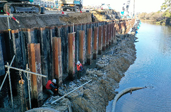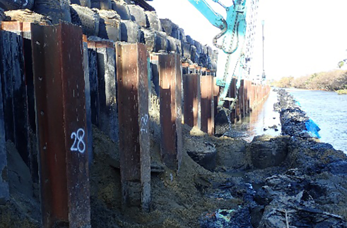 鋼矢板打設前に既設護岸の床掘を完了しました。