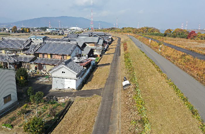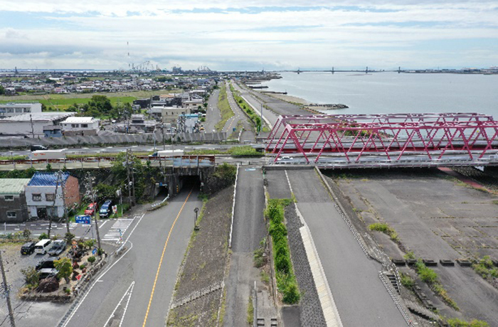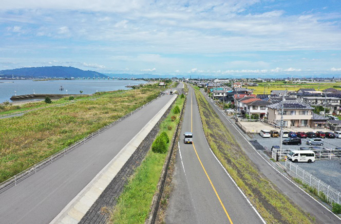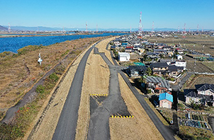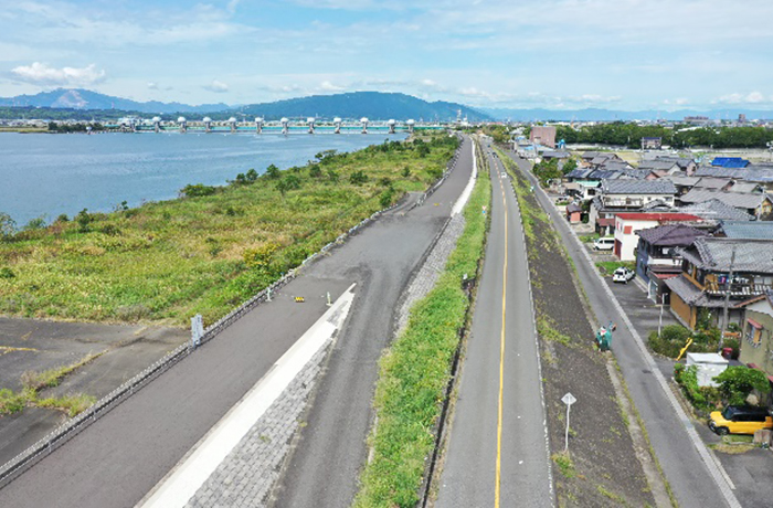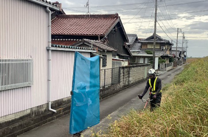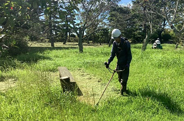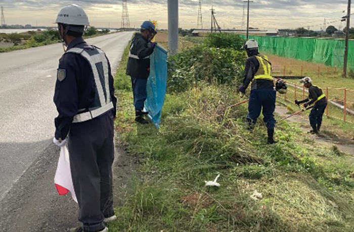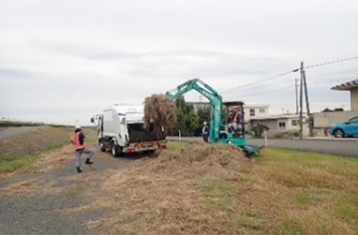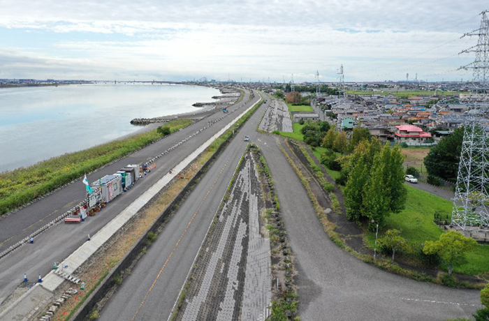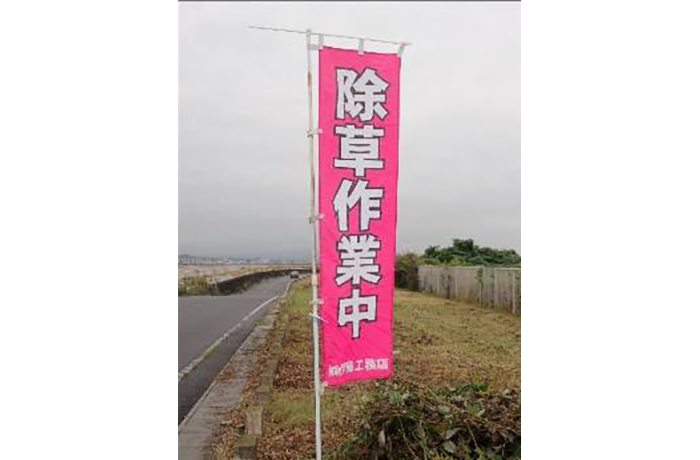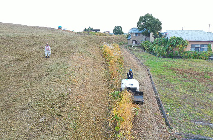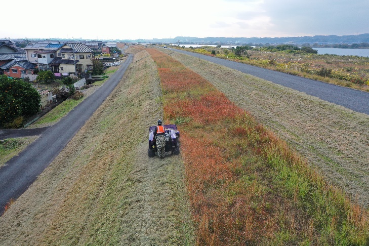 高潮堤区間の除草工を進めています。作業中の通行にご協力をお願いいたします。