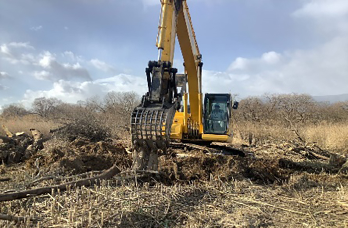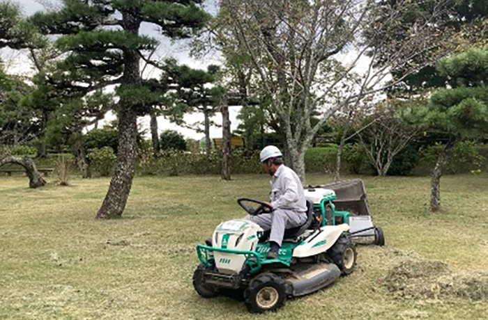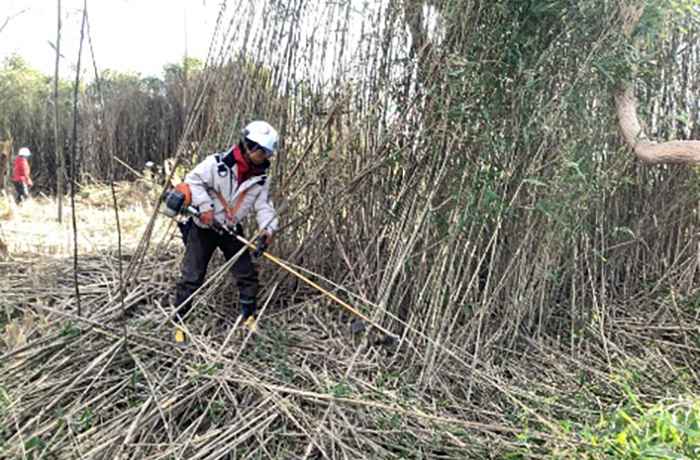 先行刈りで肩掛け式にて構造物周辺は慎重に作業を進めます。先行刈りが完了したエリアから機械除草を進めます。