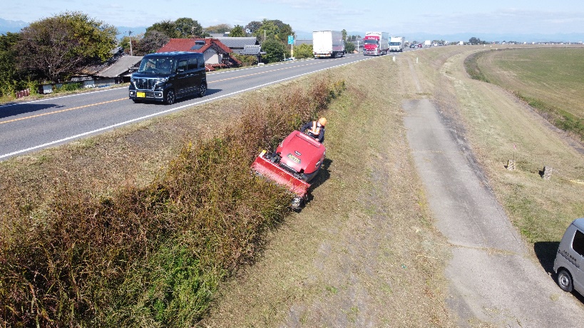 揖斐川左岸の堤防除草作業を進めています。狭隘な個所は肩掛け式にて除草を行います。