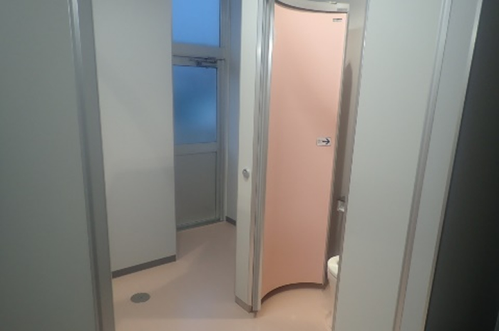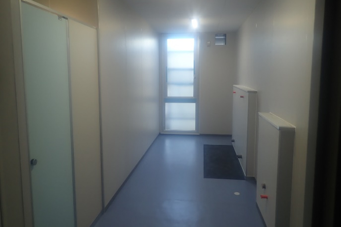 大江小学校校舎1階女子便所床・壁・天井内装工事完了、トイレブース組立中。