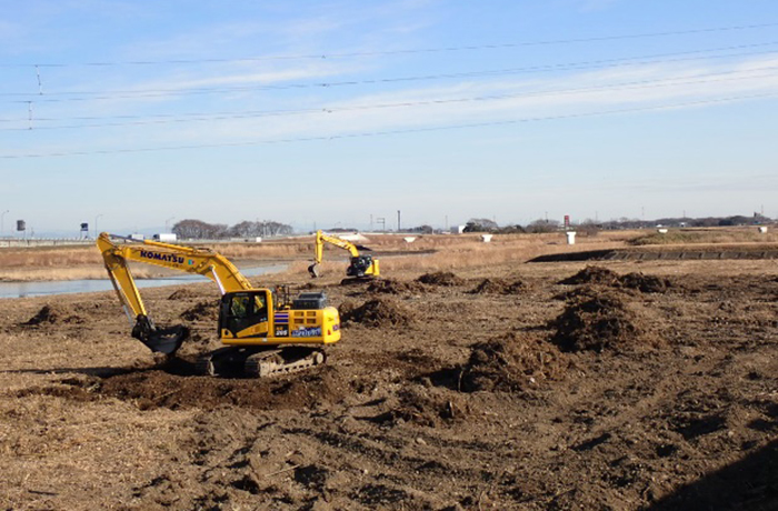 右岸工区の抜根作業を進め2月中旬には完了予定です。引続き安全施設等の撤去作業を進めて行きます。