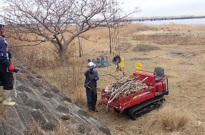 応急維持作業では揖斐川の漂流ごみの回収を行い、引き続き維持修繕作業も進めていきます。