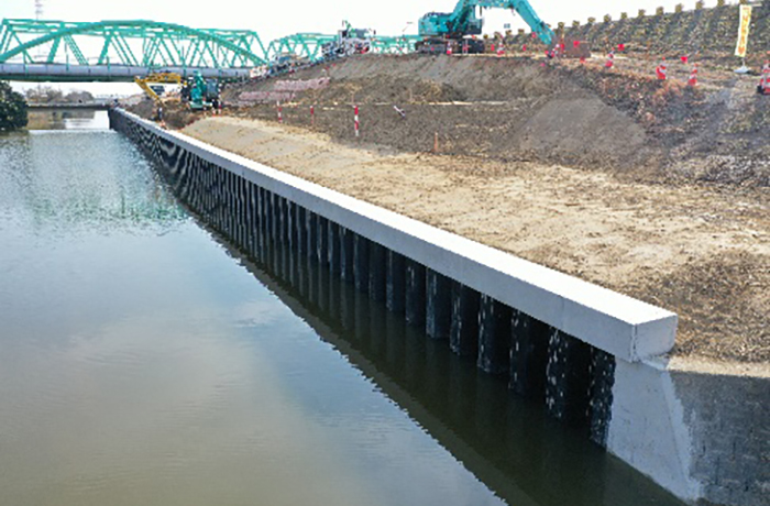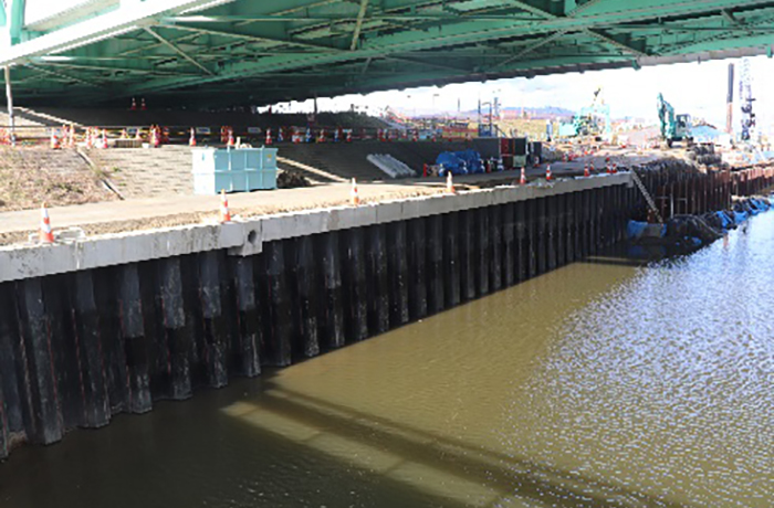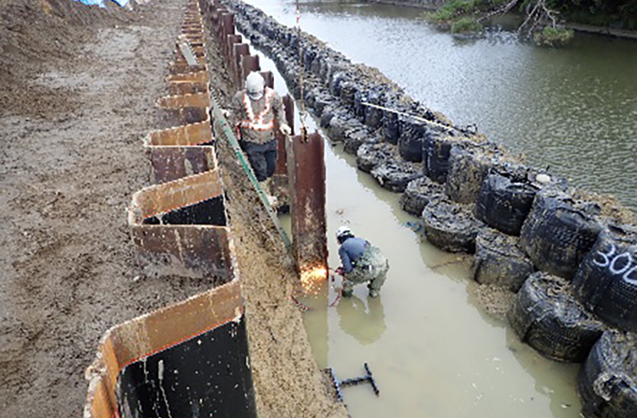 鋼矢板護岸工の矢板打設が完了しました。引き続き、既設護岸の撤去、笠コンクリートの施工を進めて行きます。