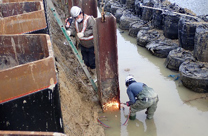 過年度施工の鋼矢板継手部について重防食塗装の試験施工を実施しました