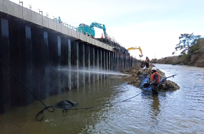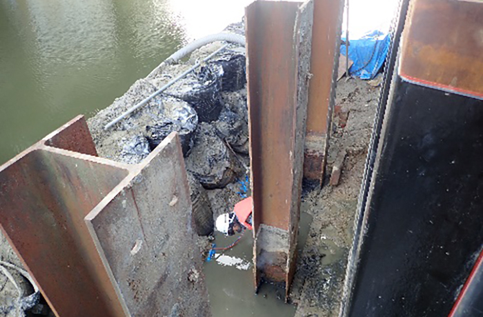 4.5H型11.5mの施工を継続しています。高速道路直下の仮締切工を撤去しました。