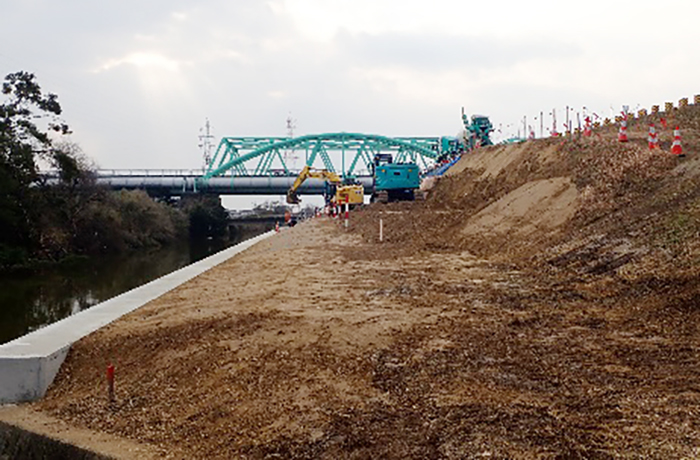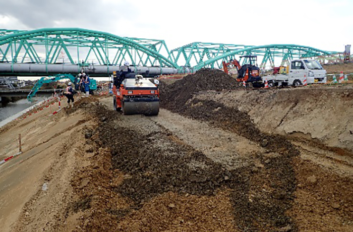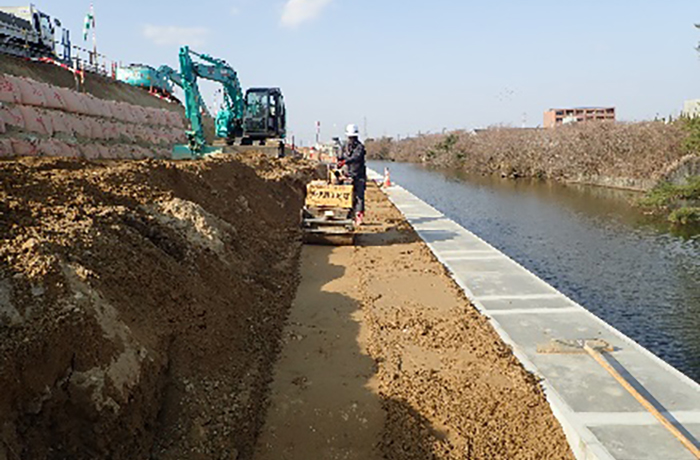河川土工(埋戻し・堤防復旧)堤防開削土を利用し堤防の復旧作業と法面仕上げ作業を進めています