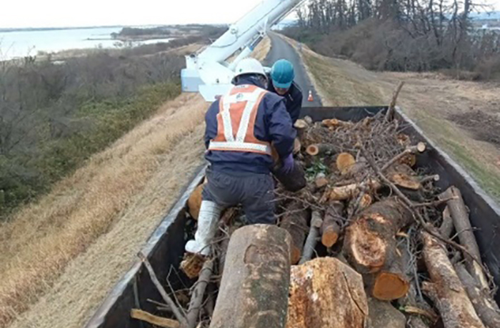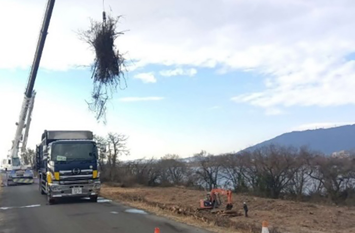 葛木工区の伐採木の搬出が完了しました。堤防道路の通行止めにご協力いただき有難うございました。