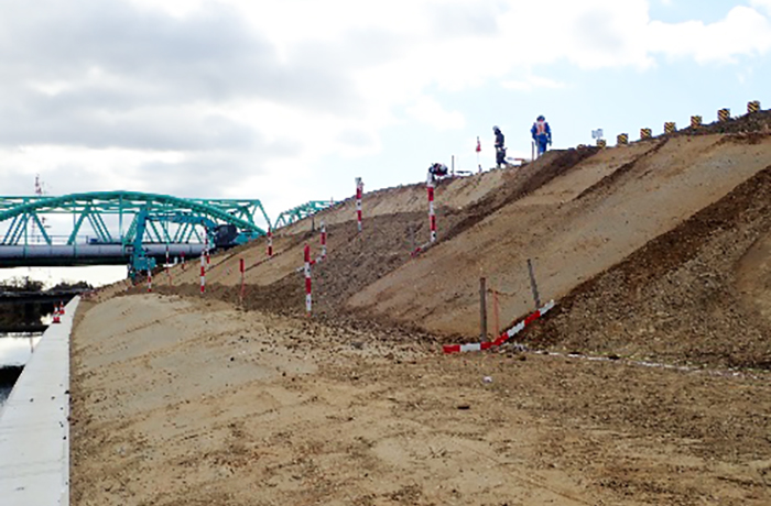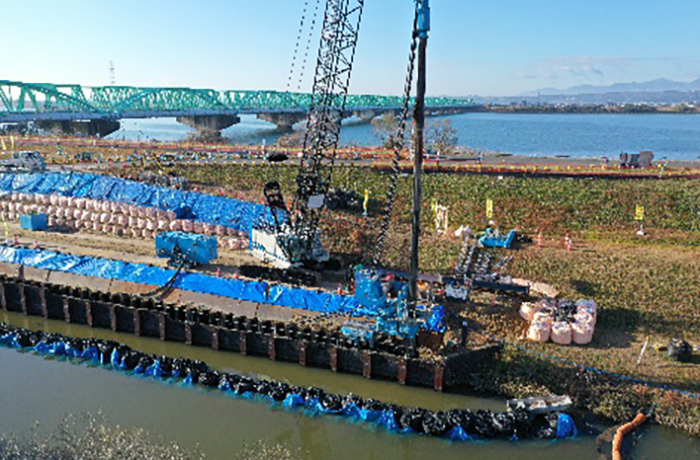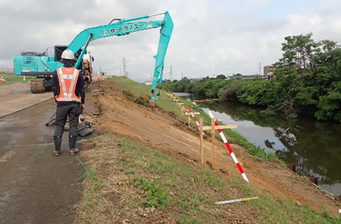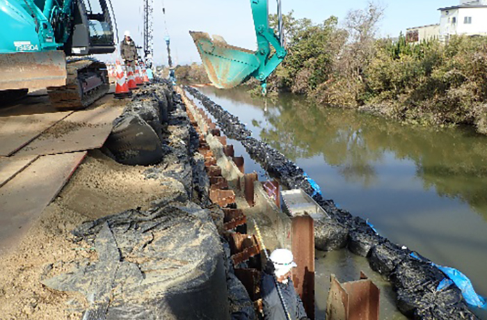 10月に入り鋼矢板打設の為のヤード整備として堤防掘削を開始しました。表土除去から開始。現地盤が砂質土であり崩落の危険性が有り大型土嚢にて法尻を補強しシートにて法面を養生します。