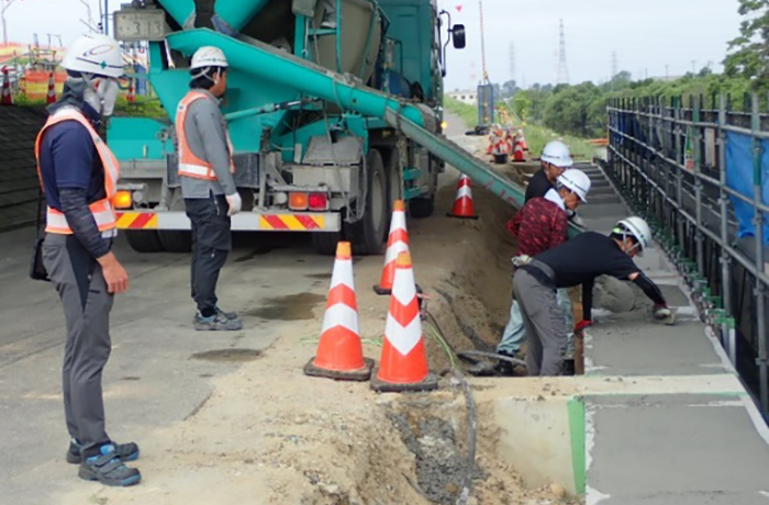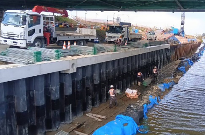 9月より高速道路直下の施工に入りました。過年度施工に続き、既設護岸(コンクリートパネル・H鋼)の撤去を先行し笠コンクリートの施工を進めています。