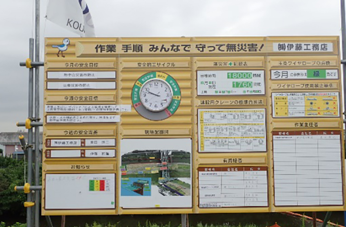 安全掲示板にはドローンにて撮影した垂直写真に重機などの位置をマグネットで張り付け安全管理に役立てています。