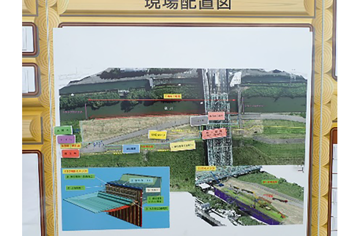 本格的な現場着手前に安全施設等の設置、迂回路などの設置を進めています。9月より高速直下の工事に取り掛かります。現場着手に伴い工事区間の堤防天端は通行止めとなります。