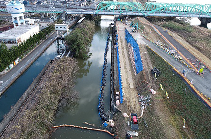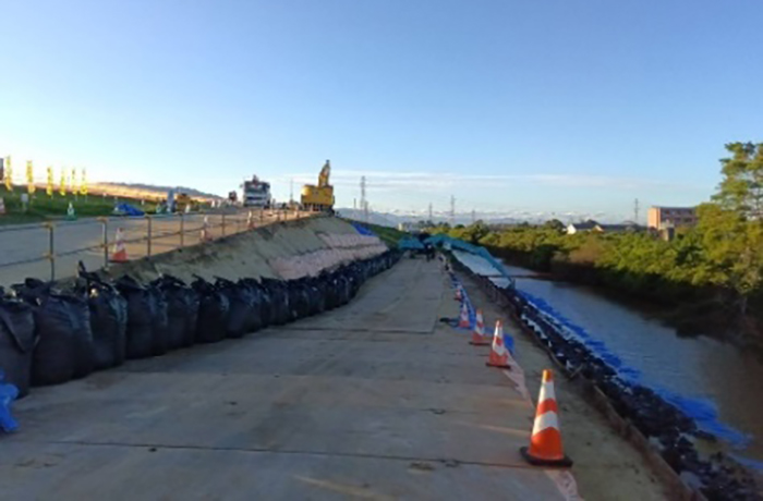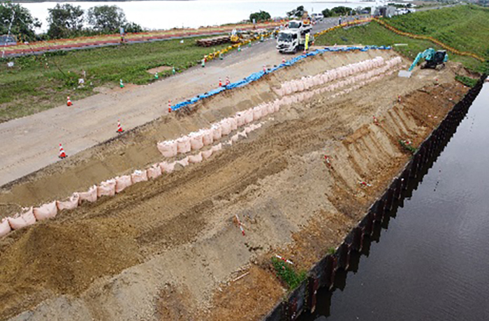 10月1日より仮設ヤード整備として堤防掘削を開始、崩落防止対策として大型土嚢にて法尻を補強、シートにて養生を行います。