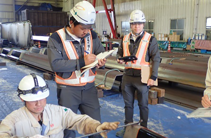 鋼矢板護岸に使用する矢板の工場検査を実施しました。