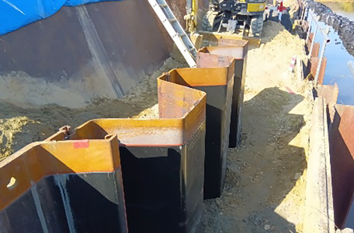 下流部より施工した14mのⅥL型107枚が打設完了、異形矢板を打設し45H型11.5mの打設を進めます。
