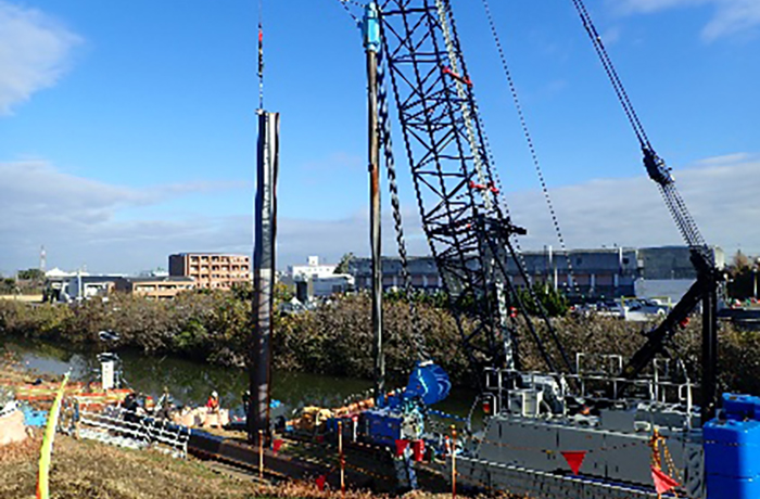 11月末で鋼矢板の施工が約65%完了しました。引き続き鋼矢板の施工を進めて行きます。