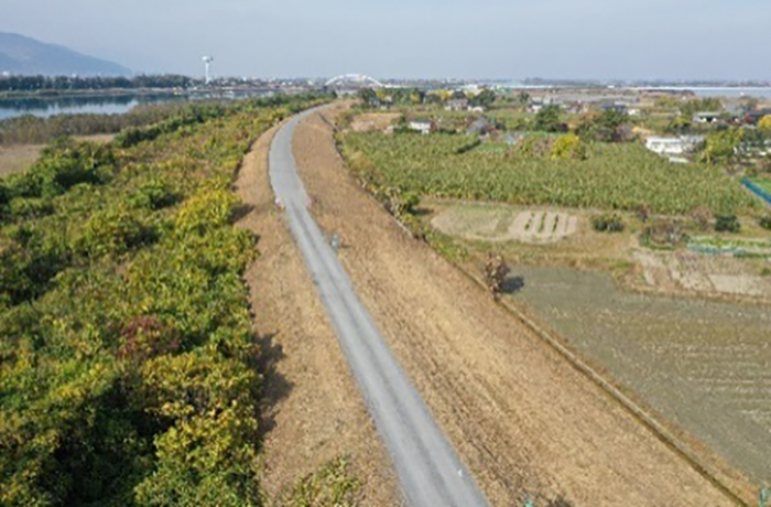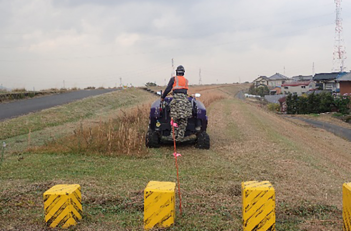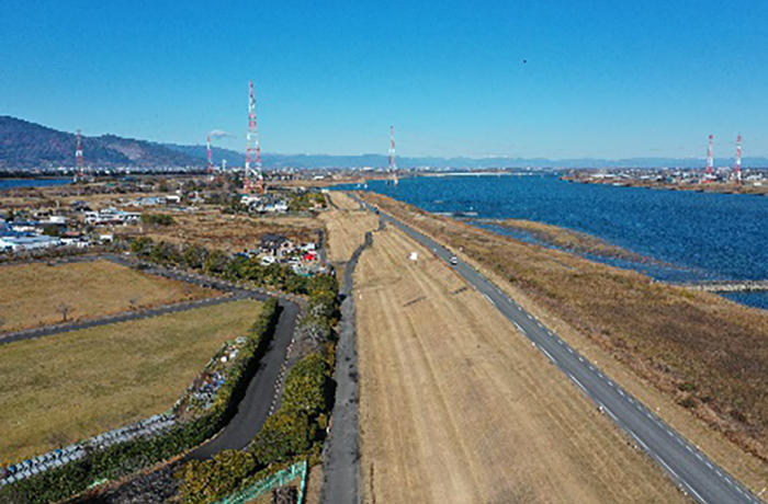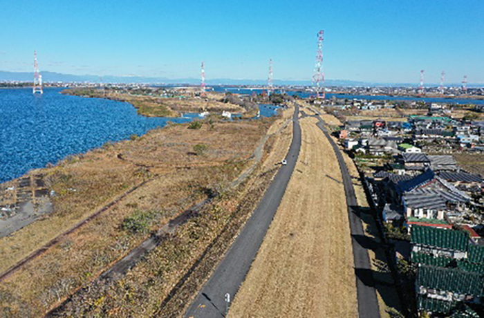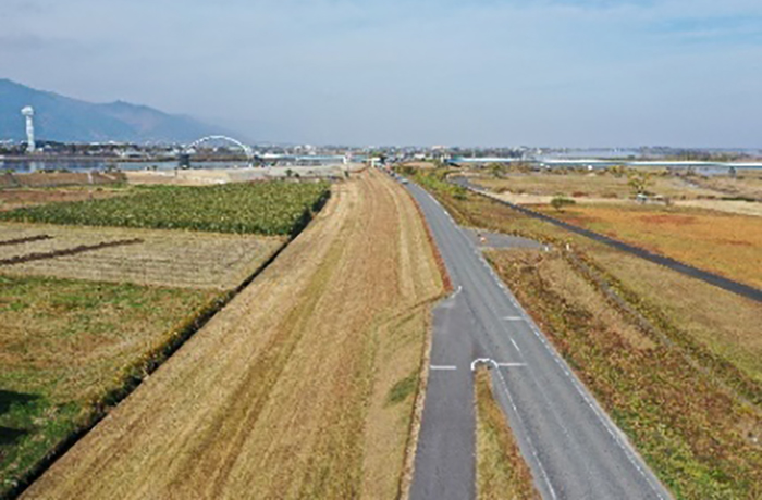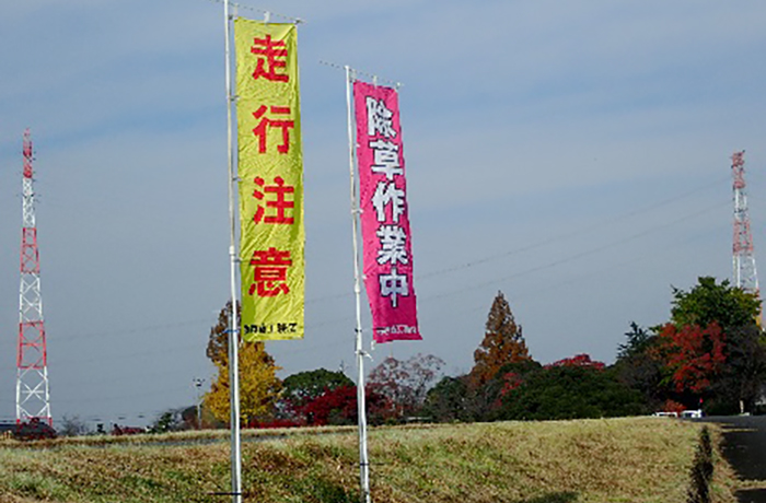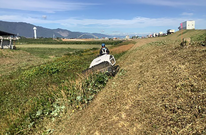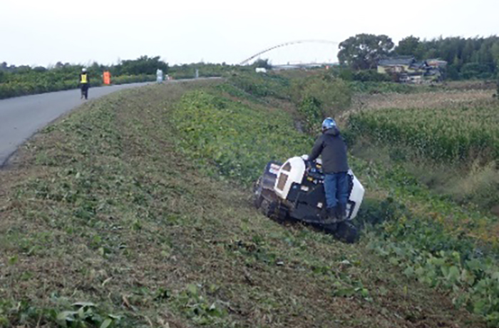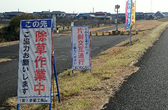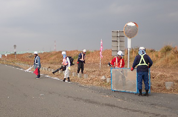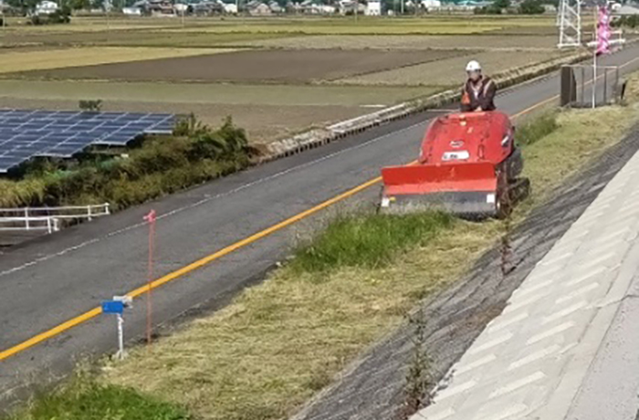 高潮堤区間の除草工を進めています。作業中の通行にご協力をお願いいたします。