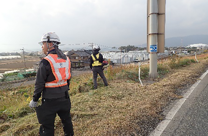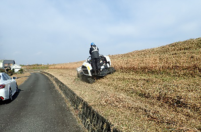 先行刈りで肩掛け式にて構造物周辺は慎重に作業を進めます。先行刈りが完了したエリアから機械除草を進めます。